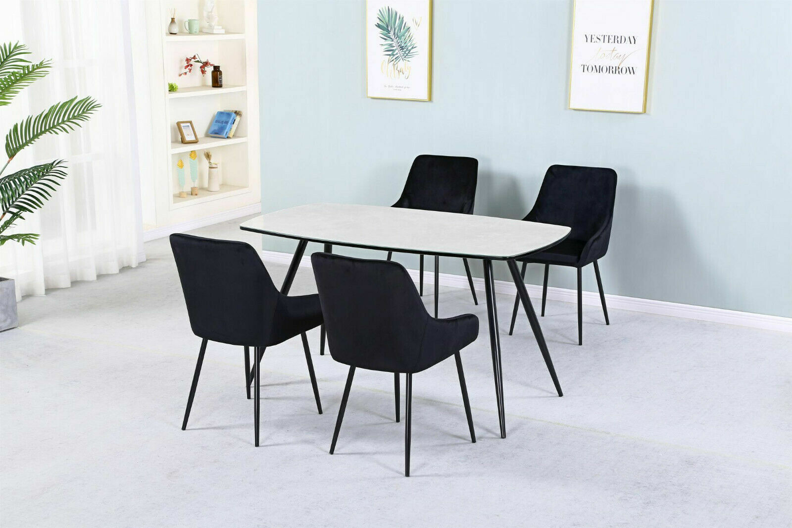 Dining Kitchen Table Glass Top Marble Effect Four Velvet Black Chairs Black Legs
