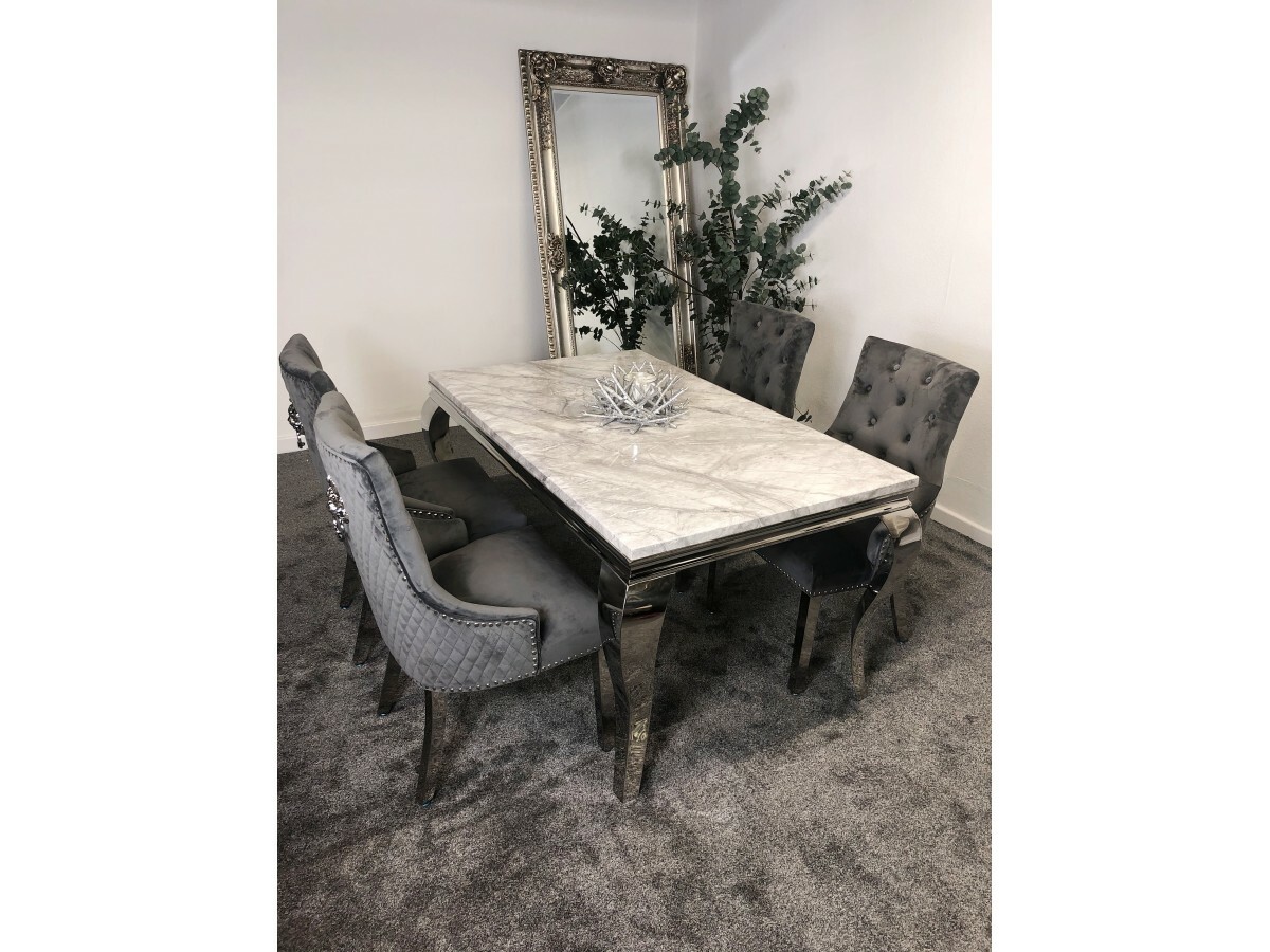 Louis 150cm Grey Marble Dining Table + 4 Dark Grey Lion Plush Velvet Chairs