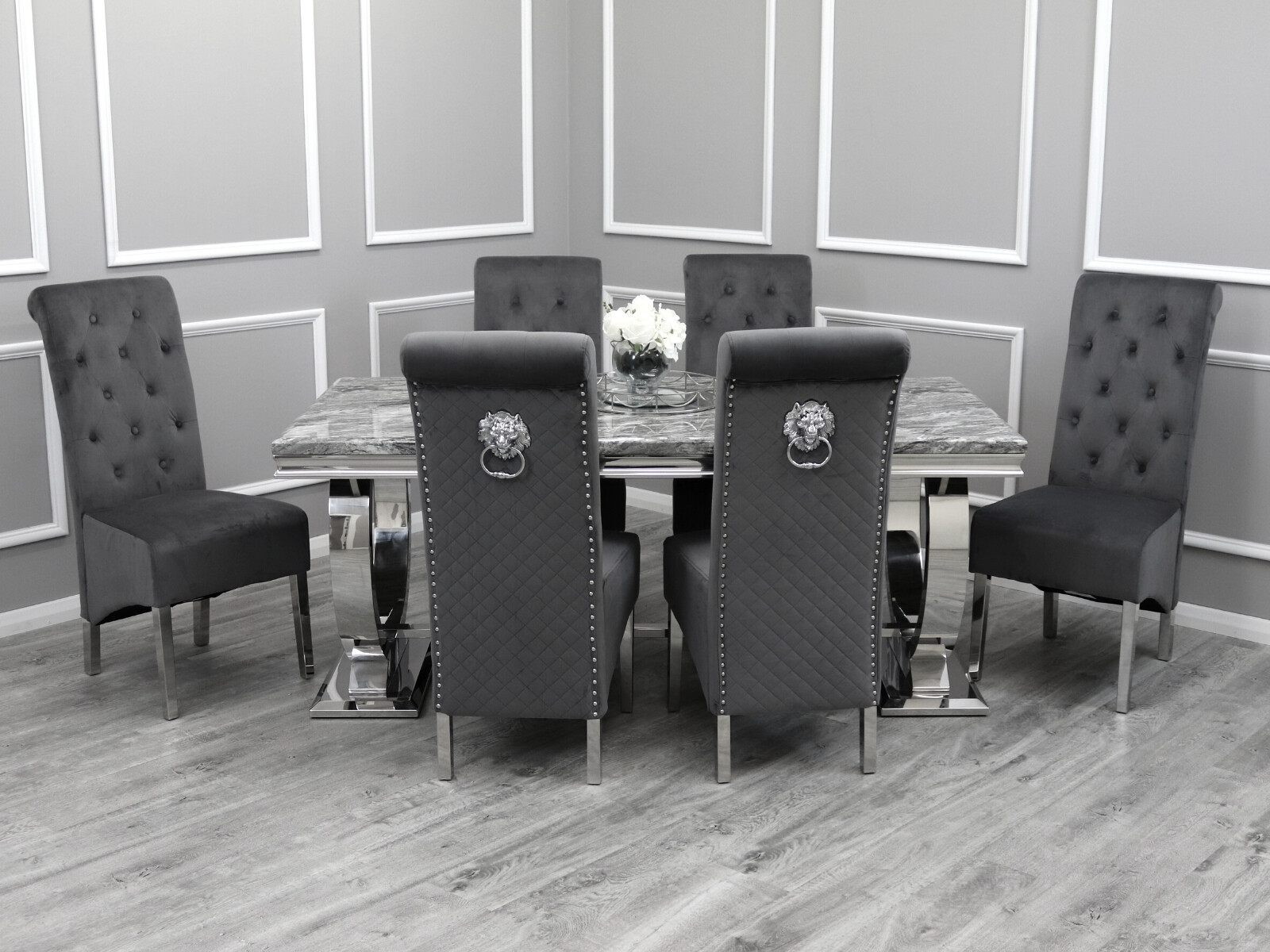 Rani Grey Marble 200CM Dining Table + Lucy Grey Lion Knocker Velvet Chairs